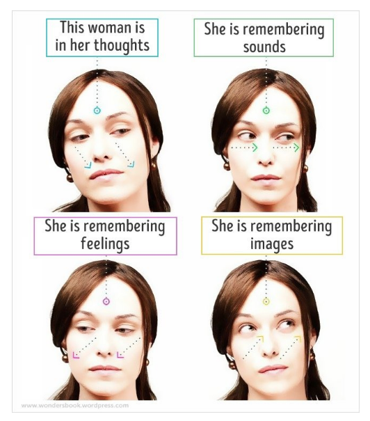 Jika arah pandangan mata penemuduga merujuk selari di bahagian kanan seperti gambar kedua, beliau sedang memikirkan tentang bunyi manakala jika arah matanya ke arah atas pula beliau sebenarnya sedang berfikir tentang gambaran.
