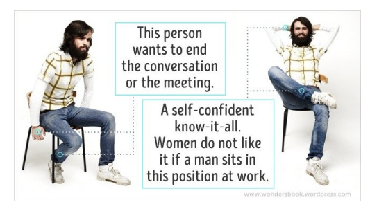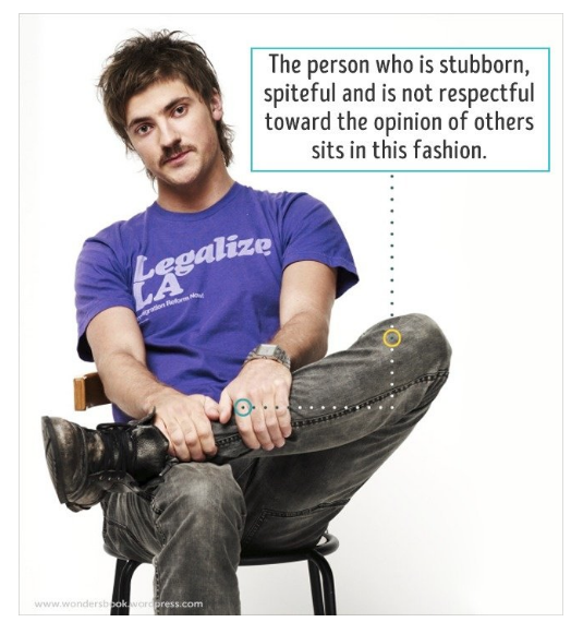 Duduk dengan tegak serta sopan semasa anda ditemuduga. Jangan sesekali duduk dengan mengangkat kaki ke riba seperti dalam gambar. Gaya duduk seperti itu sangatlah tidak sopan. Penemuduga akan melabel anda sebagai tidak tahu adab dan kesannya anda mungkin tidak akan diambil bekerja dengan syarikat tersebut.
