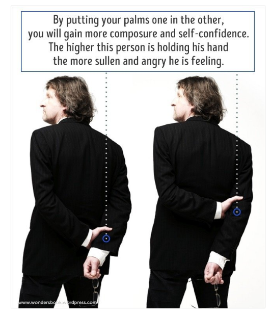 Dengan cara menyilang tangan di belakang dan memegang lengan, itu bermaksud penemuduga menunjukkan rasa marah terhadap anda. Lagi tinggi tangannya dipegang pada lengan, bermakna lagi bertambah kemarahannya. Jadi, sila hati-hati jika penemuduga membuat begini.