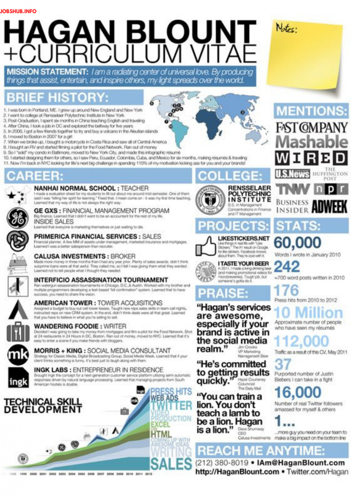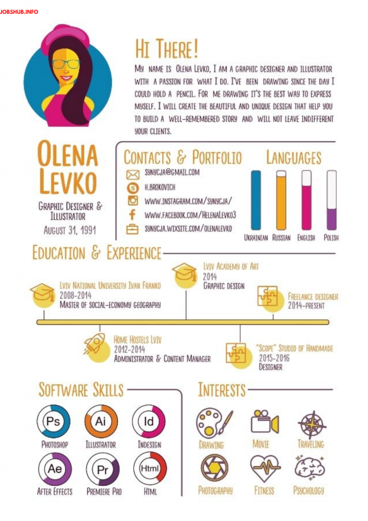 Tidak seperti resume berbentuk asas yang lain yang menggunakan tulisan untuk menyenaraikan pengalaman kerja, pendidikan dan kemahiran calon, resume infografik menggunakan layout, warna, reka bentuk, format, ikon, dan pelbagai jenis font untuk mengatur isi kandungan resume.