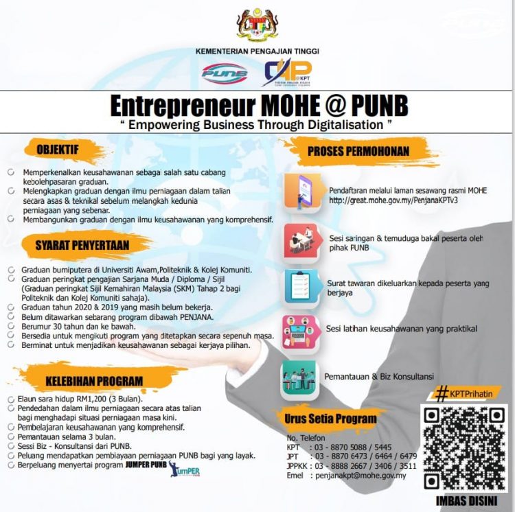 Perhatian buat graduan tahun 2020 dan 2019 yang masih belum bekerja! Tawaran khas buat graduan untuk menyertai Program Entrepreneur MOHE@PUNB ” Empowering Business Through Digitalisation” di bawah PENJANA KPT-CAP.