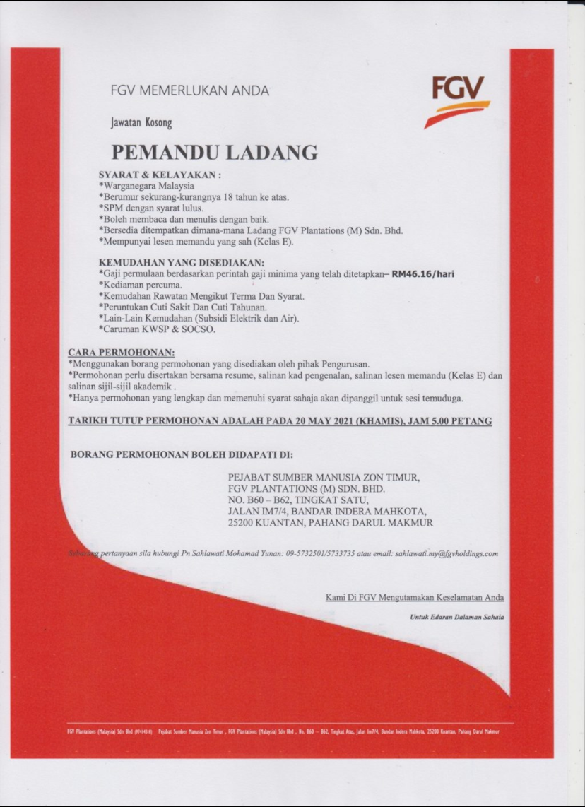 - Nama Majikan: FGV Plantations (M) Sdn Bhd