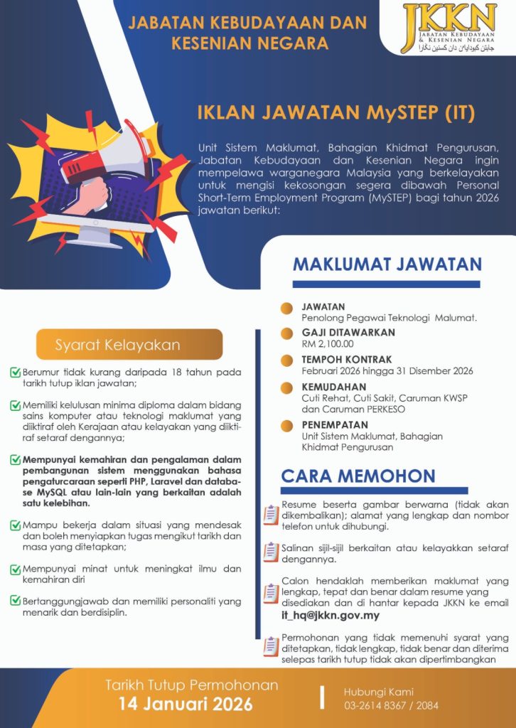 Ikaln Kini Jabatan Kebudayaan Dan Kesenian Negara (JKKN) / Jawatan Kosong Penolong Pegawai Teknologi Maklumat