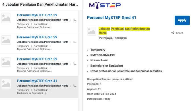 Permohonan jawatan ini boleh dibuat melalui Portal MyFutureJobs. Sila ke Portal MyFutureJobs dan Masukkan Kata Carian “JABATAN PENILAIAN DAN PERKHIDMATAN HARTA” di bahagian carian untuk memohon jawatan yang diiklankan.