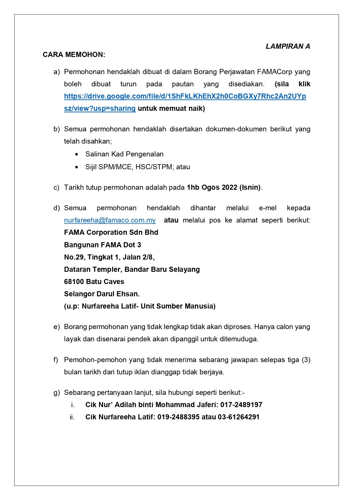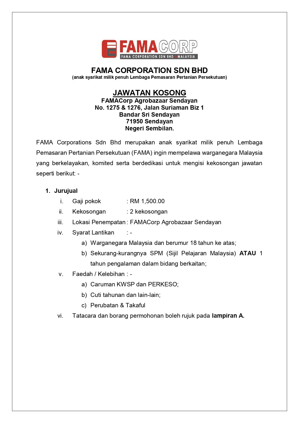 Iklan Jawatan FAMA Corporation Sdn Bhd