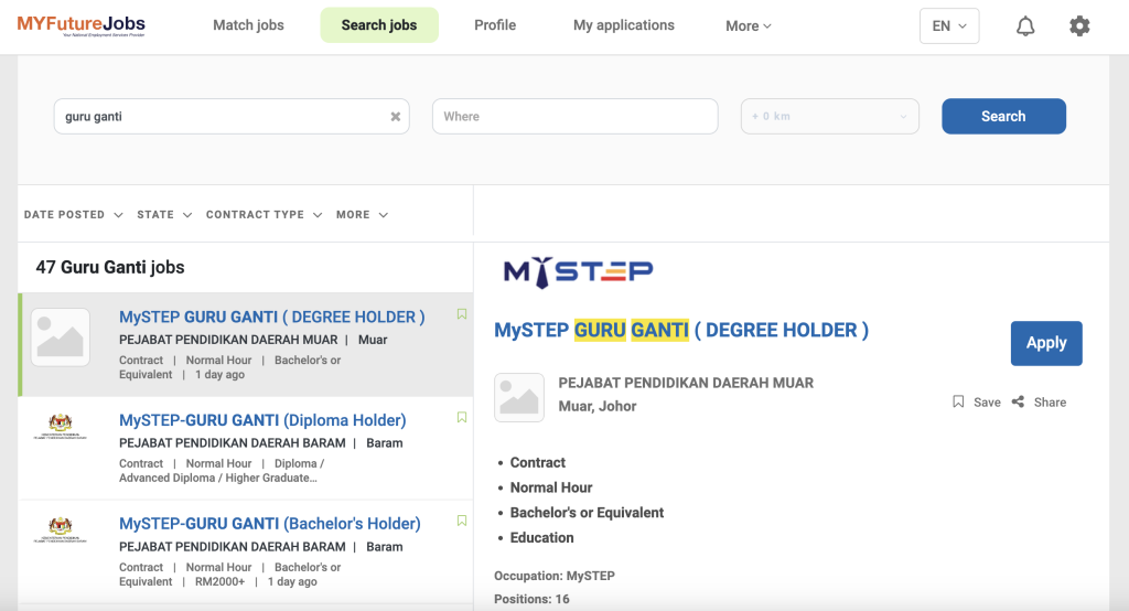 Iklan Guru Ganti KPM Permohonan Guru Ganti boleh dibuat melalui Portal MyFutureJobs. Sila ke Portal MyFutureJobs dan Masukkan Kata Carian “GURU GANTI” di bahagian carian untuk memohon jawatan Guru Ganti yang diiklankan.