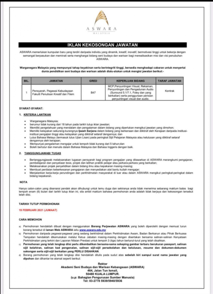 Iklan Jawatan Akademi Seni Budaya Dan Warisan Kebangsaan (ASWARA)
