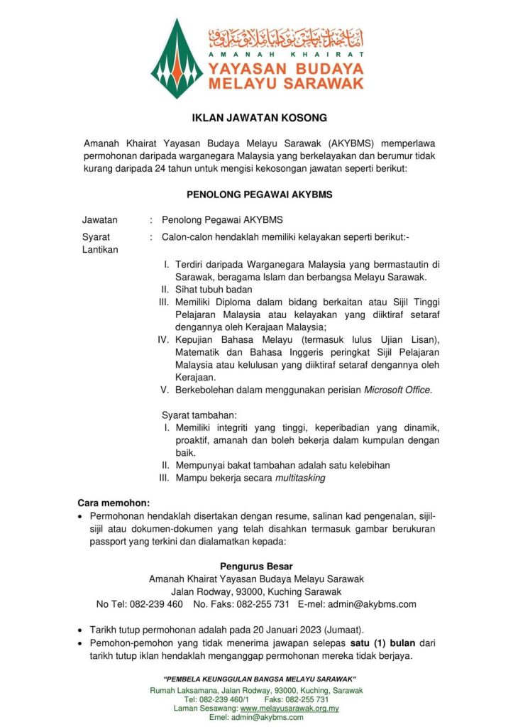 Iklan Jawatan Amanah Khairat Yayasan Budaya Melayu Sarawak (AKYBMS)