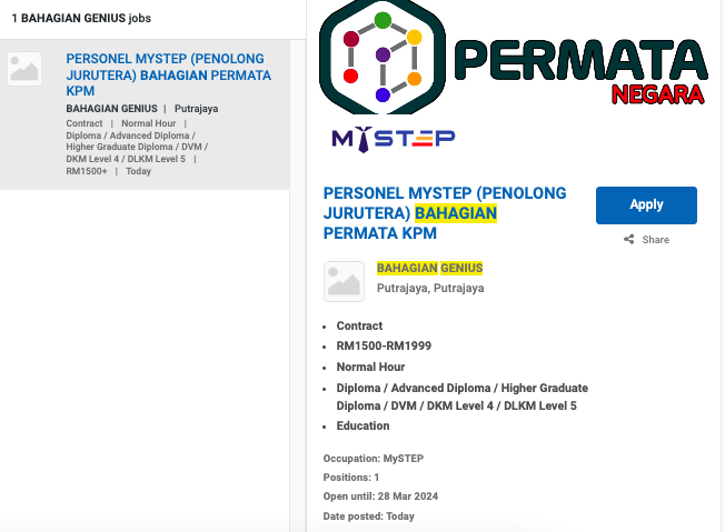 Permohonan jawatan ini boleh dibuat melalui Portal MyFutureJobs. Sila ke Portal MyFutureJobs dan Masukkan Kata Carian yang ingin dicari “BAHAGIAN GENIUS” di bahagian carian untuk memohon jawatan yang diiklankan.