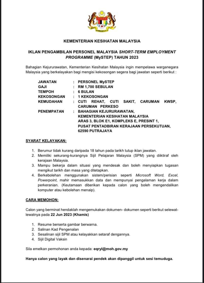 Iklan Jawatan Bahagian Kejururawatan, Kementerian Kesihatan Malaysia (KKM)