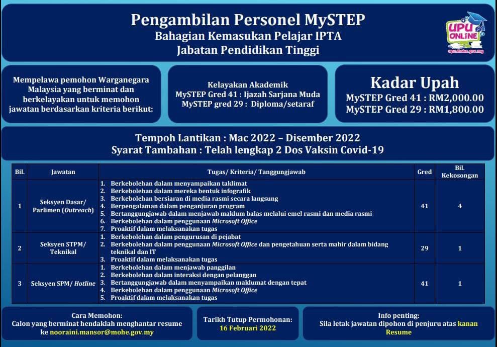 Iklan Jawatan Bahagian Kemasukan Pelajar IPTA, Jabatan Pendidikan Tinggi