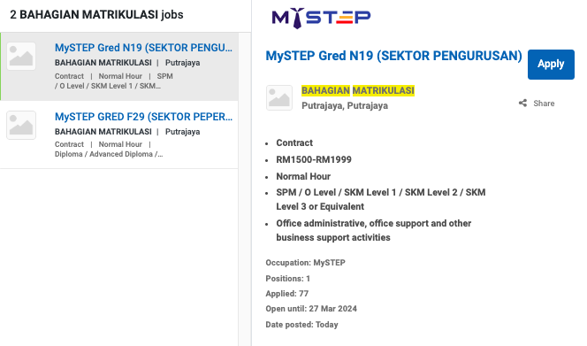 Permohonan jawatan ini boleh dibuat melalui Portal MyFutureJobs. Sila ke Portal MyFutureJobs dan Masukkan Kata Carian yang ingin dicari BAHAGIAN MATRIKULASI di bahagian carian untuk memohon jawatan yang diiklankan.