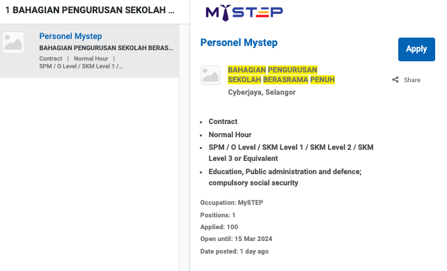 Permohonan jawatan ini boleh dibuat melalui Portal MyFutureJobs. Sila ke Portal MyFutureJobs dan Masukkan Kata Carian yang ingin dicari “BAHAGIAN PENGURUSAN SEKOLAH BERASRAMA PENUH” di bahagian carian untuk memohon jawatan yang diiklankan.