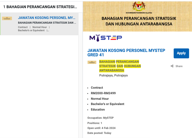 Iklan Jawatan Bahagian Perancangan Strategik & Hubungan Antarabangsa, Kementerian Pendidikan Malaysia (KPM)
