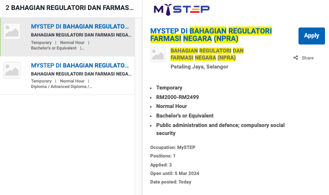 Permohonan jawatan ini boleh dibuat melalui Portal MyFutureJobs. Sila ke Portal MyFutureJobs dan Masukkan Kata Carian yang ingin dicari “BAHAGIAN REGULATORI DAN FARMASI NEGARA (NPRA)” di bahagian carian untuk memohon jawatan yang diiklankan.