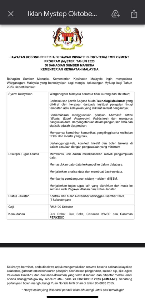 Iklan Jawatan Bahagian Sumber Manusia,Kementerian Kesihatan Malaysia (KKM)