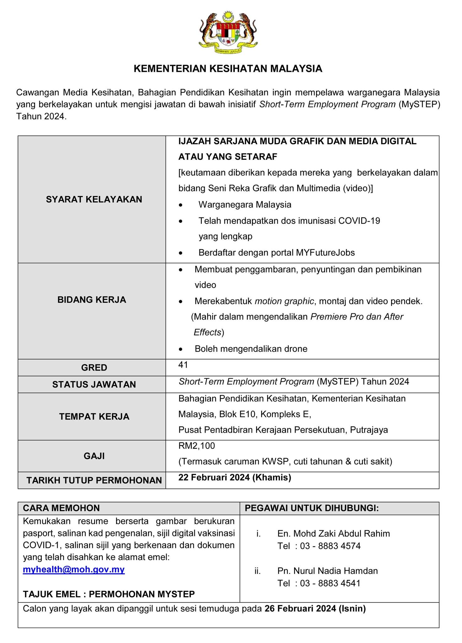 Iklan Jawatan Cawangan Media Kesihatan,Bahagian Pendidikan Kesihatan,Kementerian Kesihatan Malaysia (KKM)
