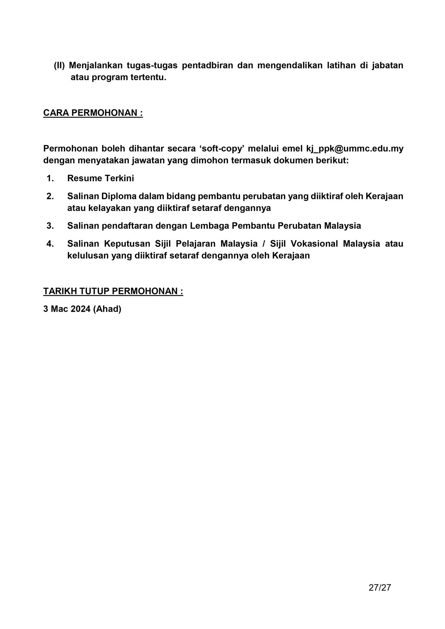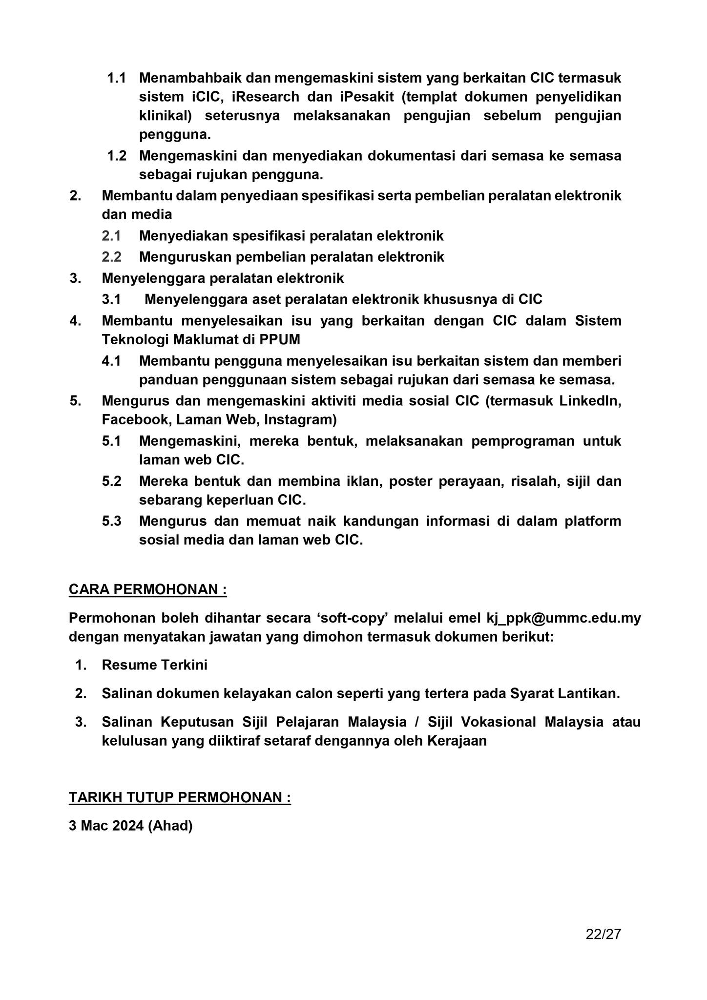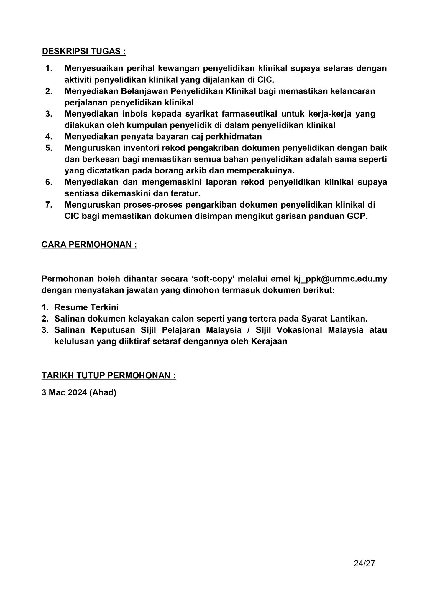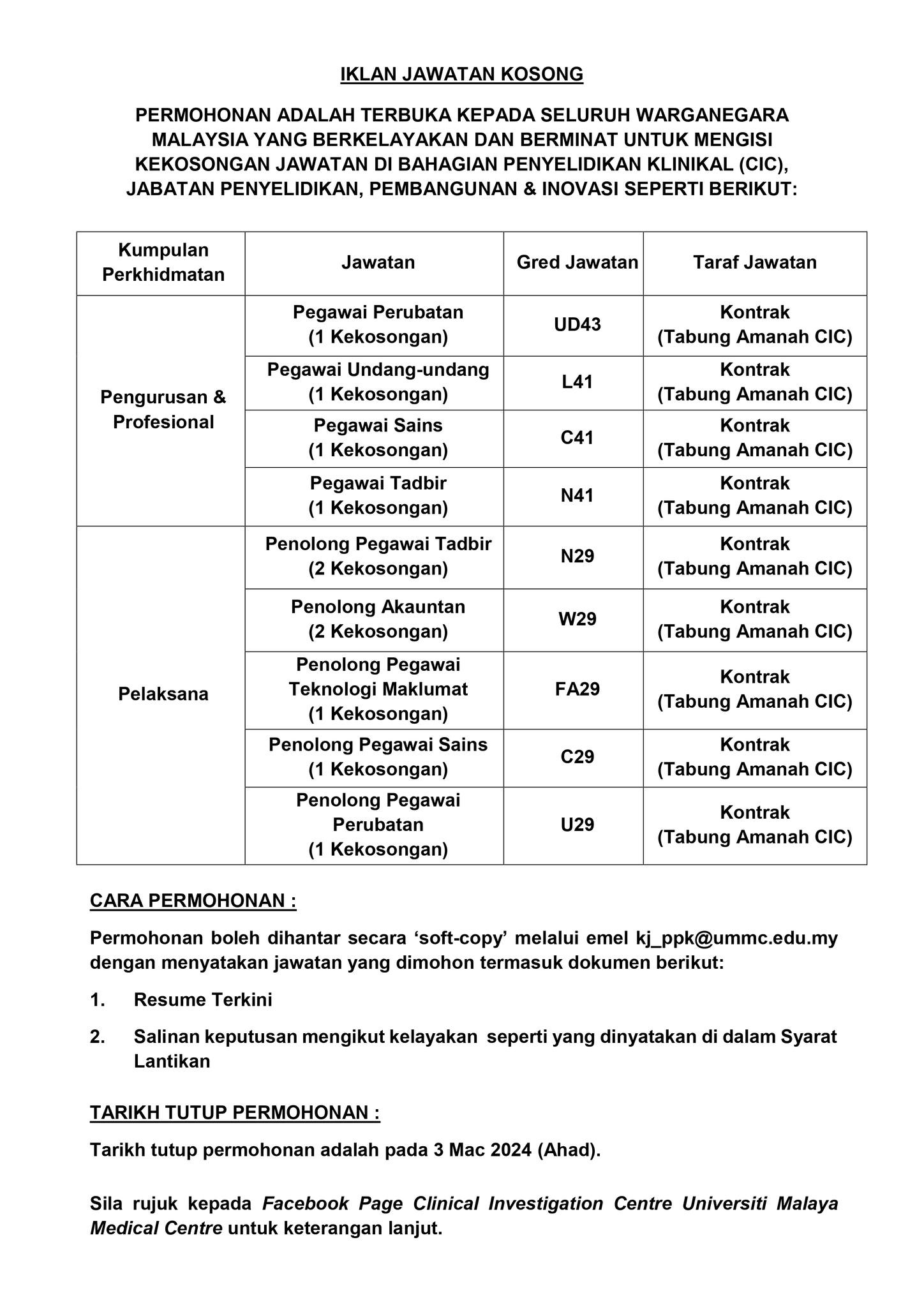 Iklan Jawatan Clinical Investigation Centre (CIC) University Of Malaya Medical Centre