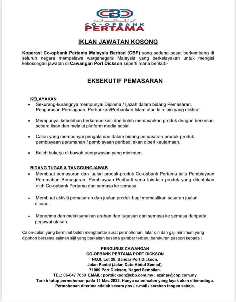 Iklan Jawatan Co-Opbank Pertama Malaysia Berhad