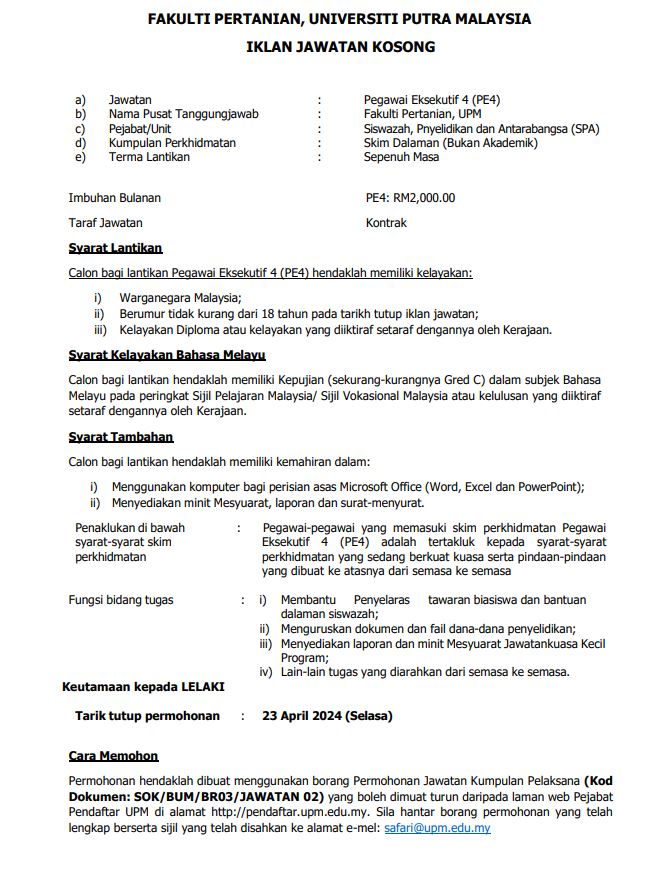 Iklan Jawatan Fakulti Pertanian, Universiti Putra Malaysia (UPM)