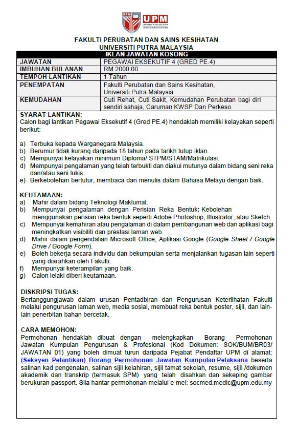 Iklan Jawatan Fakulti Perubatan Dan Sains Kesihatan, Universiti Putra Malaysia (UPM) BORANG PERMOHONAN