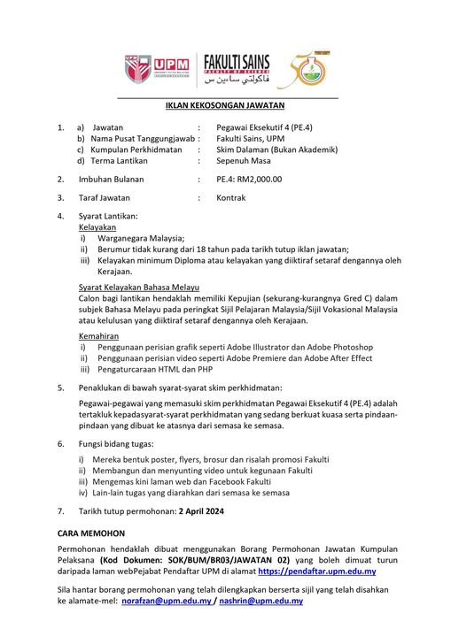 Iklan Jawatan Fakulti Sains, Universiti Putra Malaysia (UPM)