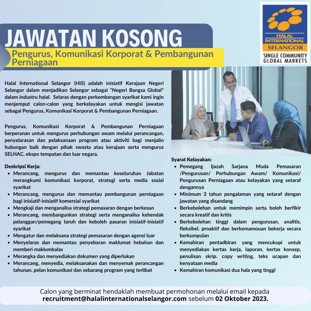 Iklan Jawatan Halal International Selangor, Menteri Besar Selangor (Incorporated)
