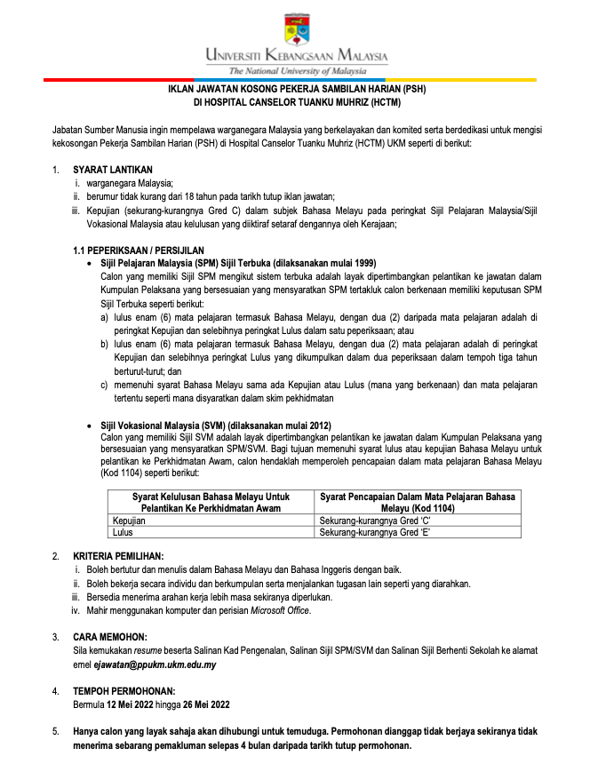 Iklan Jawatan Hospital Canselor Tuanku Muhriz (HCTM) UKM