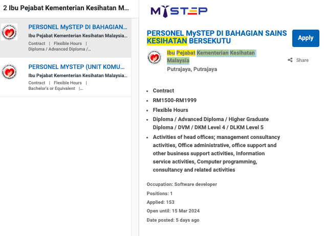 Permohonan jawatan ini boleh dibuat melalui Portal MyFutureJobs. Sila ke Portal MyFutureJobs dan Masukkan Kata Carian yang ingin dicari “Ibu Pejabat Kementerian Kesihatan Malaysia” di bahagian carian untuk memohon jawatan yang diiklankan.