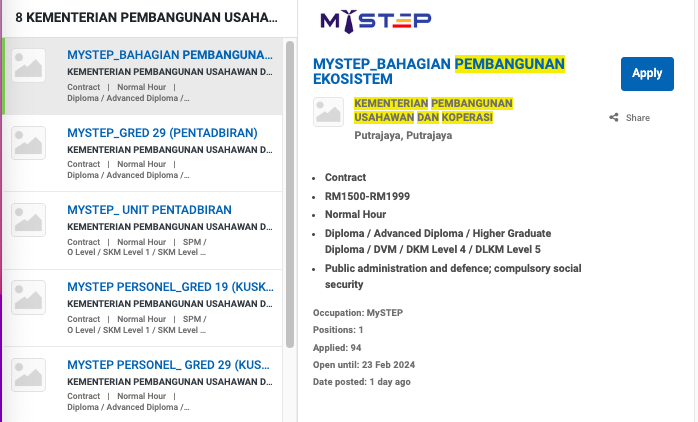 Permohonan jawatan ini boleh dibuat melalui Portal MyFutureJobs. Sila ke Portal MyFutureJobs dan Masukkan Kata Carian “Ibu Pejabat Kementerian Kesihatan Malaysia” di bahagian carian untuk memohon jawatan yang diiklankan.