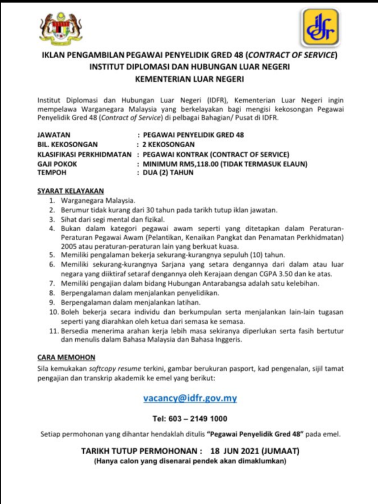 Iklan Jawatan Institut Diplomasi Dan Hubungan Luar Negeri (IDFR)