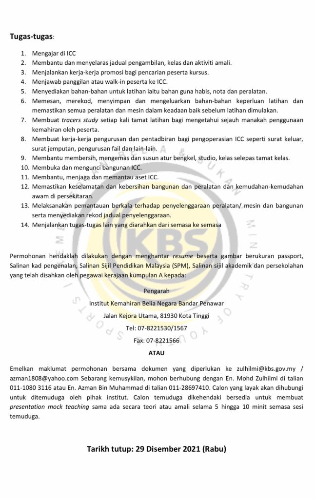 Iklan Jawatan Institut Kemahiran Belia Negara Bandar Penawar