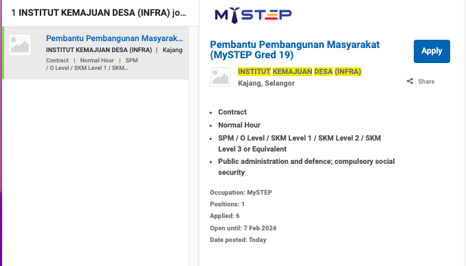 Permohonan jawatan ini boleh dibuat melalui Portal MyFutureJobs. Sila ke Portal MyFutureJobs dan Masukkan Kata Carian “INSTITUT KEMAJUAN DESA (INFRA)” di bahagian carian untuk memohon jawatan yang diiklankan.