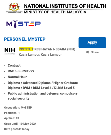 Permohonan jawatan ini boleh dibuat melalui Portal MyFutureJobs. Sila ke Portal MyFutureJobs dan Masukkan Kata Carian yang ingin dicari “INSTITUT KESIHATAN NEGARA (NIH)” di bahagian carian untuk memohon jawatan yang diiklankan.