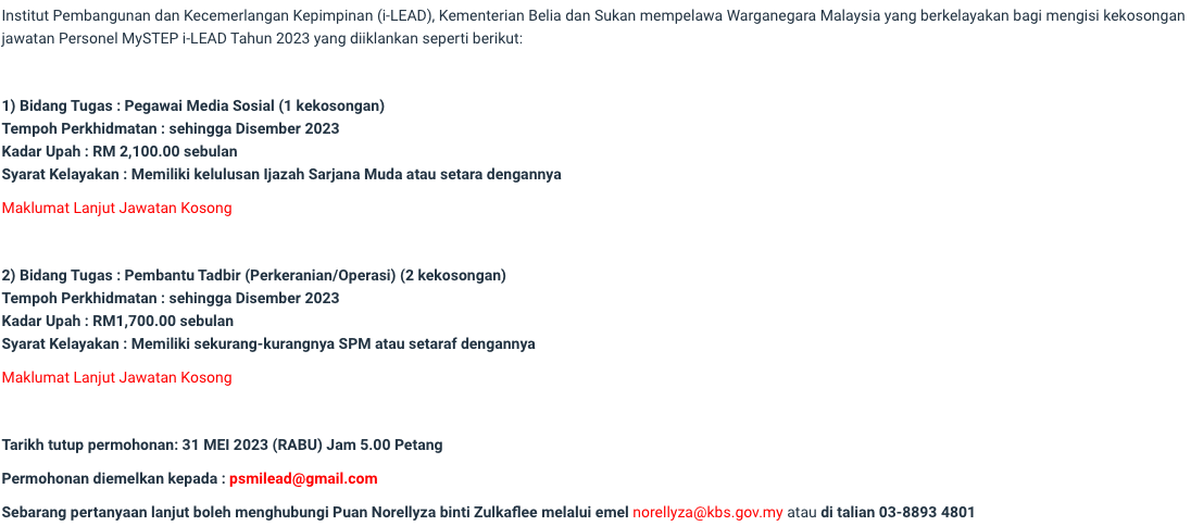 Iklan Jawatan Institut Pembangunan Dan Kecemerlangan Kepimpinan (i-LEAD)