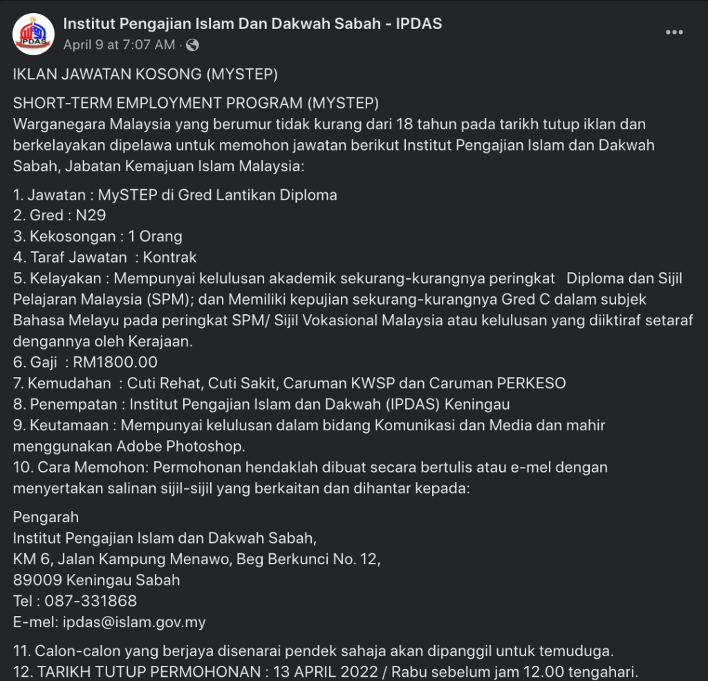Iklan Jawatan Institut Pengajian Islam Dan Dakwah Sabah – IPDAS