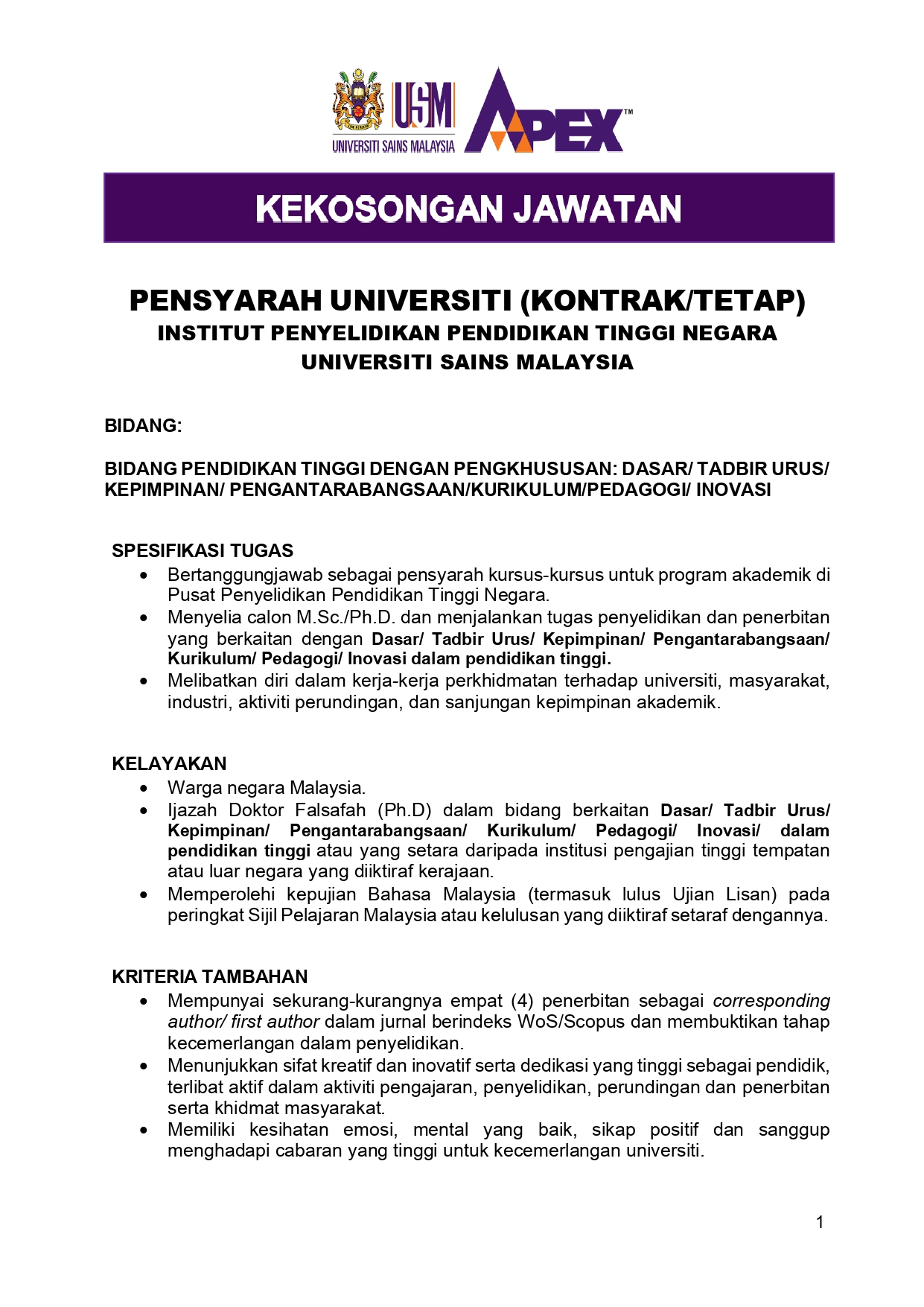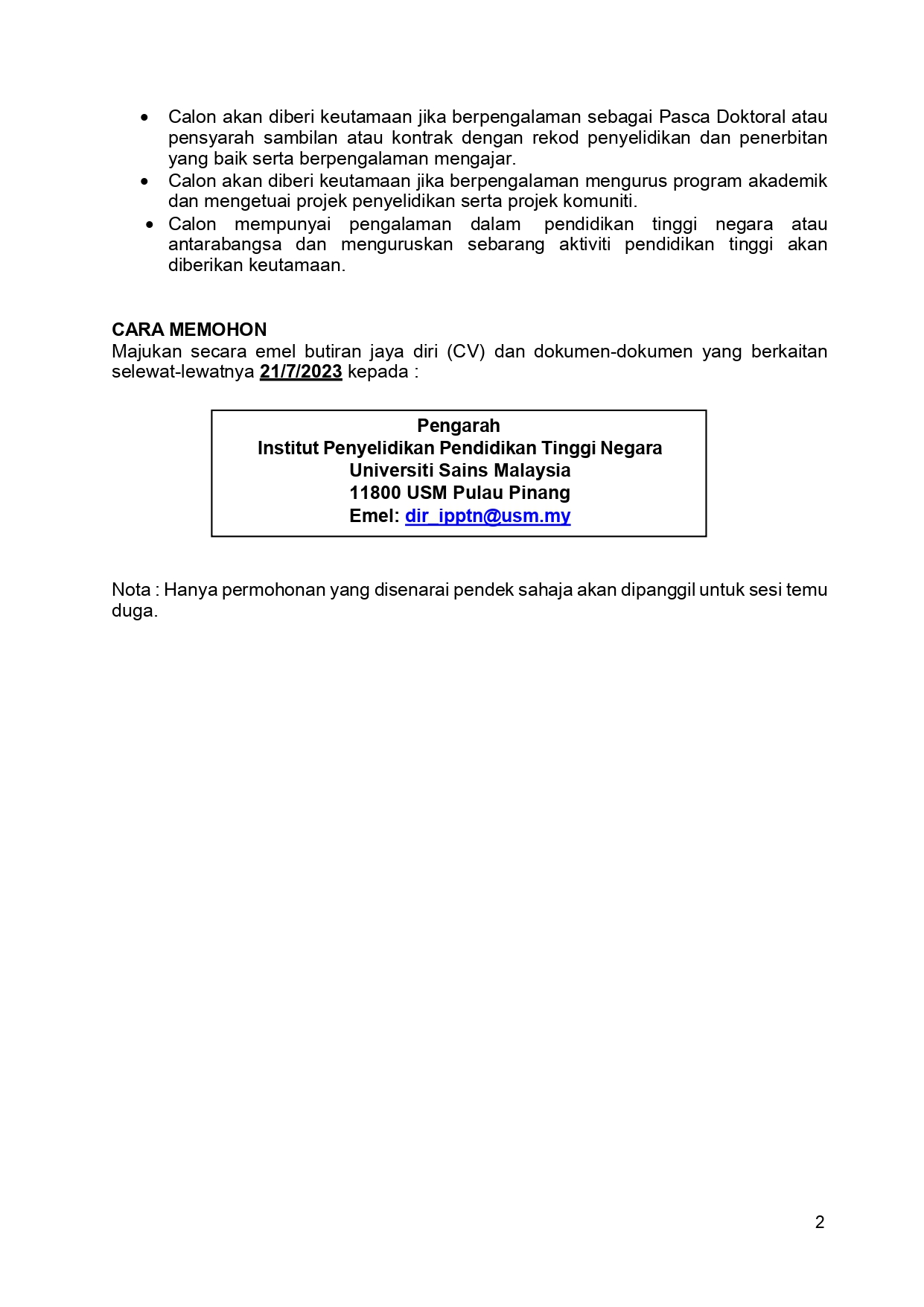 Iklan Jawatan Institut Penyelidikan Pendidkan Tinggi Negara (IPPTN, USM