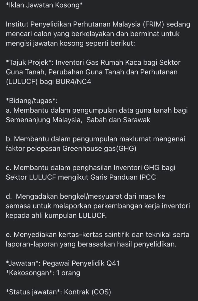 Iklan Jawatan Institut Penyelidikan Perhutanan Malaysia (FRIM)