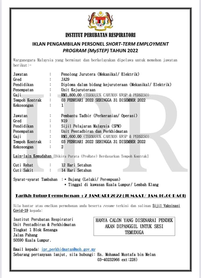 Iklan Jawatan Institut Perubatan Respiratori, Kementerian Kesihatan Malaysia