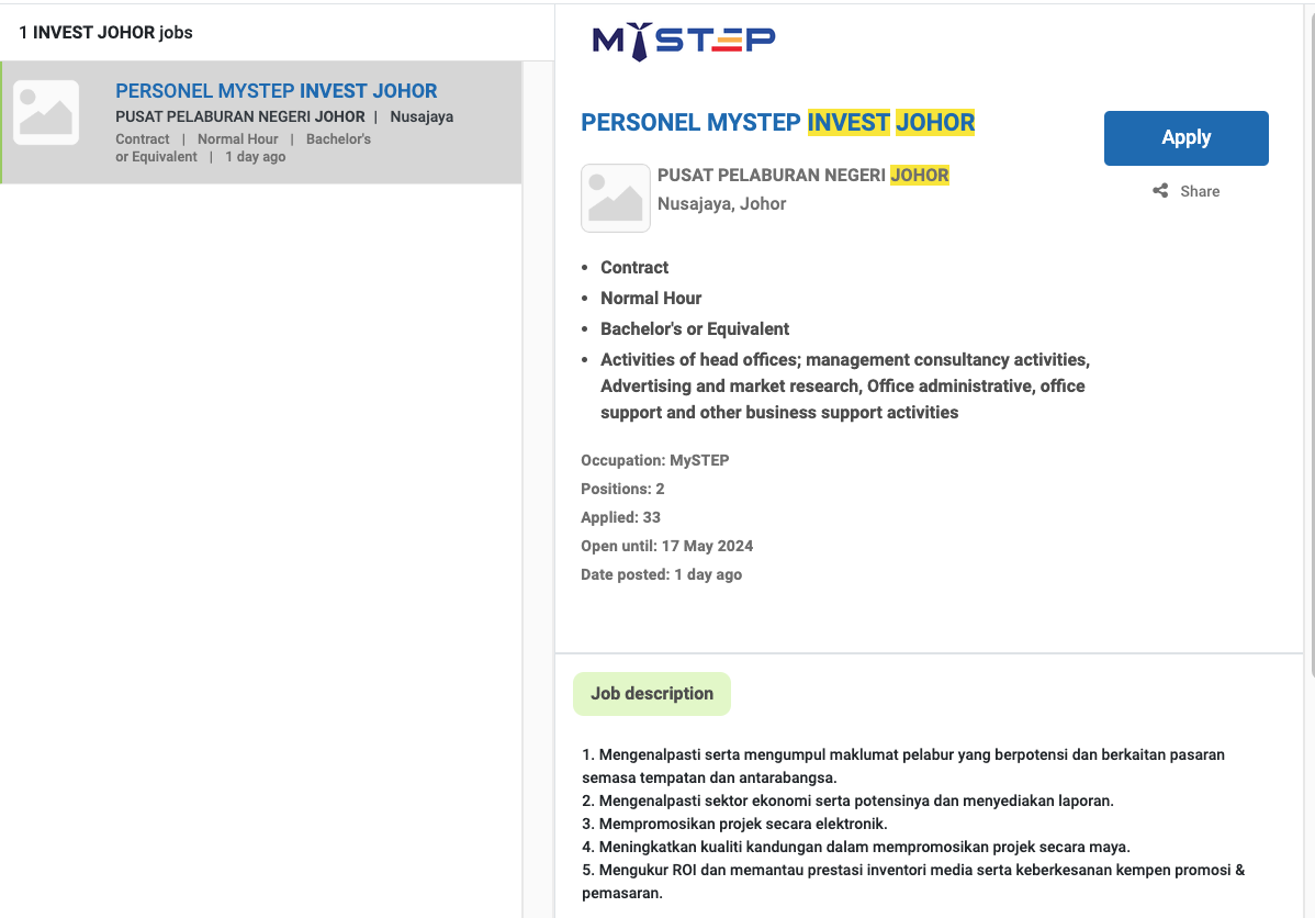 Permohonan jawatan ini boleh dibuat melalui Portal MyFutureJobs. Sila ke Portal MyFutureJobs dan Masukkan Kata Carian yang ingin dicari “INVEST JOHOR” di bahagian carian untuk memohon jawatan yang diiklankan.