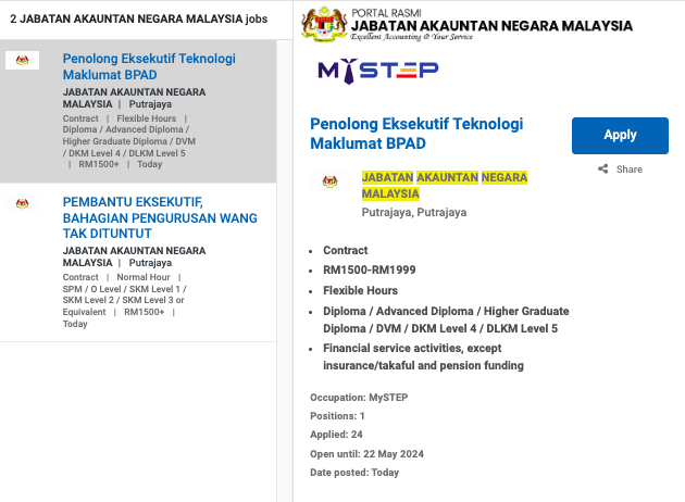 Permohonan jawatan ini boleh dibuat melalui Portal MyFutureJobs. Sila ke Portal MyFutureJobs dan Masukkan Kata Carian yang ingin dicari JABATAN AKAUNTAN NEGARA MALAYSIA di bahagian carian untuk memohon jawatan yang diiklankan.