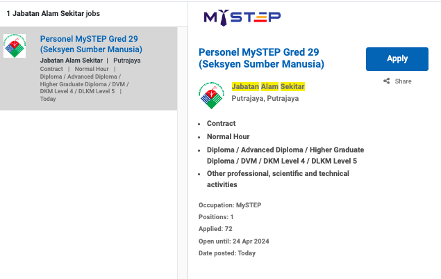 Permohonan jawatan ini boleh dibuat melalui Portal MyFutureJobs. Sila ke Portal MyFutureJobs dan Masukkan Kata Carian yang ingin dicari “Jabatan Alam Sekitar” di bahagian carian untuk memohon jawatan yang diiklankan.