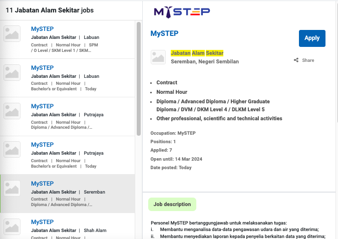 Permohonan jawatan ini boleh dibuat melalui Portal MyFutureJobs. Sila ke Portal MyFutureJobs dan Masukkan Kata Carian yang ingin dicari “JABATAN ALAM SEKITAR” di bahagian carian untuk memohon jawatan yang diiklankan.