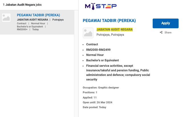Permohonan jawatan ini boleh dibuat melalui Portal MyFutureJobs. Sila ke Portal MyFutureJobs dan Masukkan Kata Carian yang ingin dicari “JABATAN AUDIT NEGARA” di bahagian carian untuk memohon jawatan yang diiklankan.