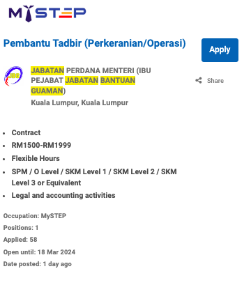 - Setelah mendaftar, anda boleh terus login dan mencari bidang kerjaya yang diinginkan mengikut lokasi yang ditawarkan