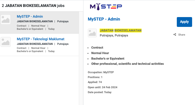 Permohonan jawatan ini boleh dibuat melalui Portal MyFutureJobs. Sila ke Portal MyFutureJobs dan Masukkan Kata Carian “JABATAN BIOKESELAMATAN” di bahagian carian untuk memohon jawatan yang diiklankan.