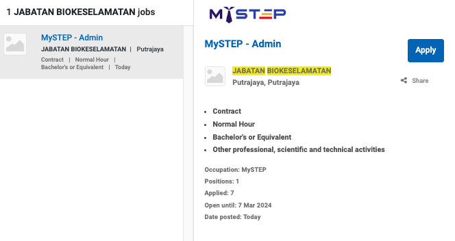 Permohonan jawatan ini boleh dibuat melalui Portal MyFutureJobs. Sila ke Portal MyFutureJobs dan Masukkan Kata Carian yang ingin dicari “JABATAN BIOKESELAMATAN” di bahagian carian untuk memohon jawatan yang diiklankan.