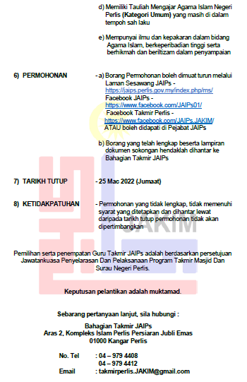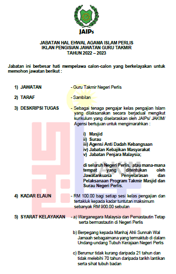 Iklan Jawatan Jabatan Hal Ehwal Agama Islam Perlis (JAIPs)