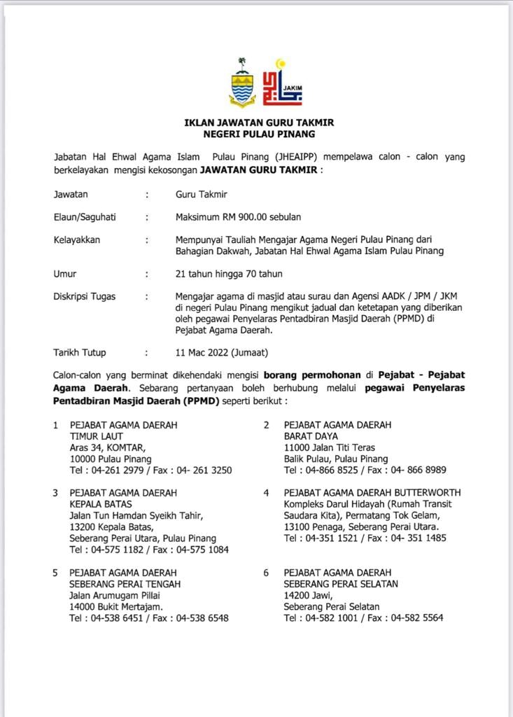 Iklan Jawatan Jabatan Hal Ehwal Agama Islam Pulau Pinang