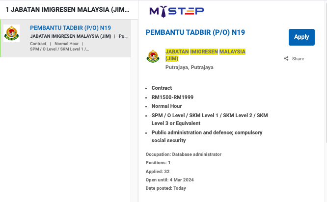 Permohonan jawatan ini boleh dibuat melalui Portal MyFutureJobs. Sila ke Portal MyFutureJobs dan Masukkan Kata Carian yang ingin dicari “JABATAN IMIGRESEN MALAYSIA (JIM)” di bahagian carian untuk memohon jawatan yang diiklankan.